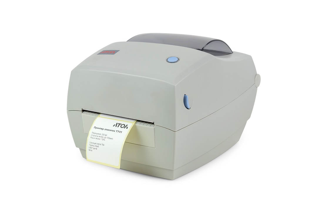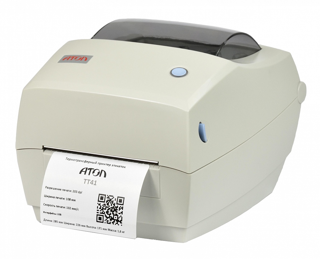 Принтер этикеток АТОЛ ТТ41 (203dpi, термотрансферная печать, USB, ширина печати 108 мм, скорость 102 мм/с) использует термотрансферный способ печати и владелец может использовать любой доступный материал на рынке, в зависимости от задачи: