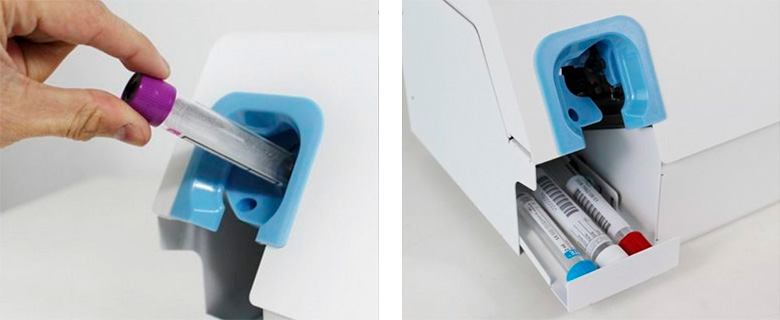 Пробирка с нанесенной этикеткой, после печати, попадает в специальный лоток-накопитель.